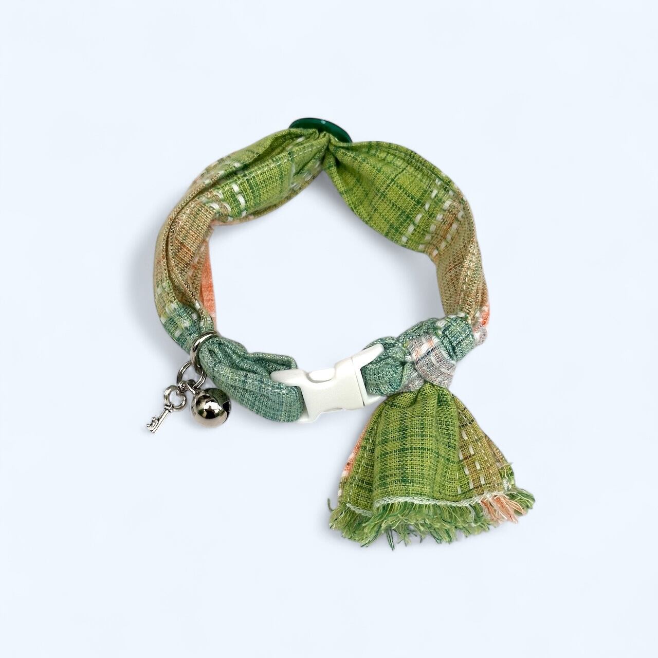 バックル部分に付いている鈴とカギのチャームは、ネコちゃんがあむあむしても外れて誤飲しないように、しっかり二重リングでセットされていますが、もちろん取り外したい場合は取り外し出来ます。