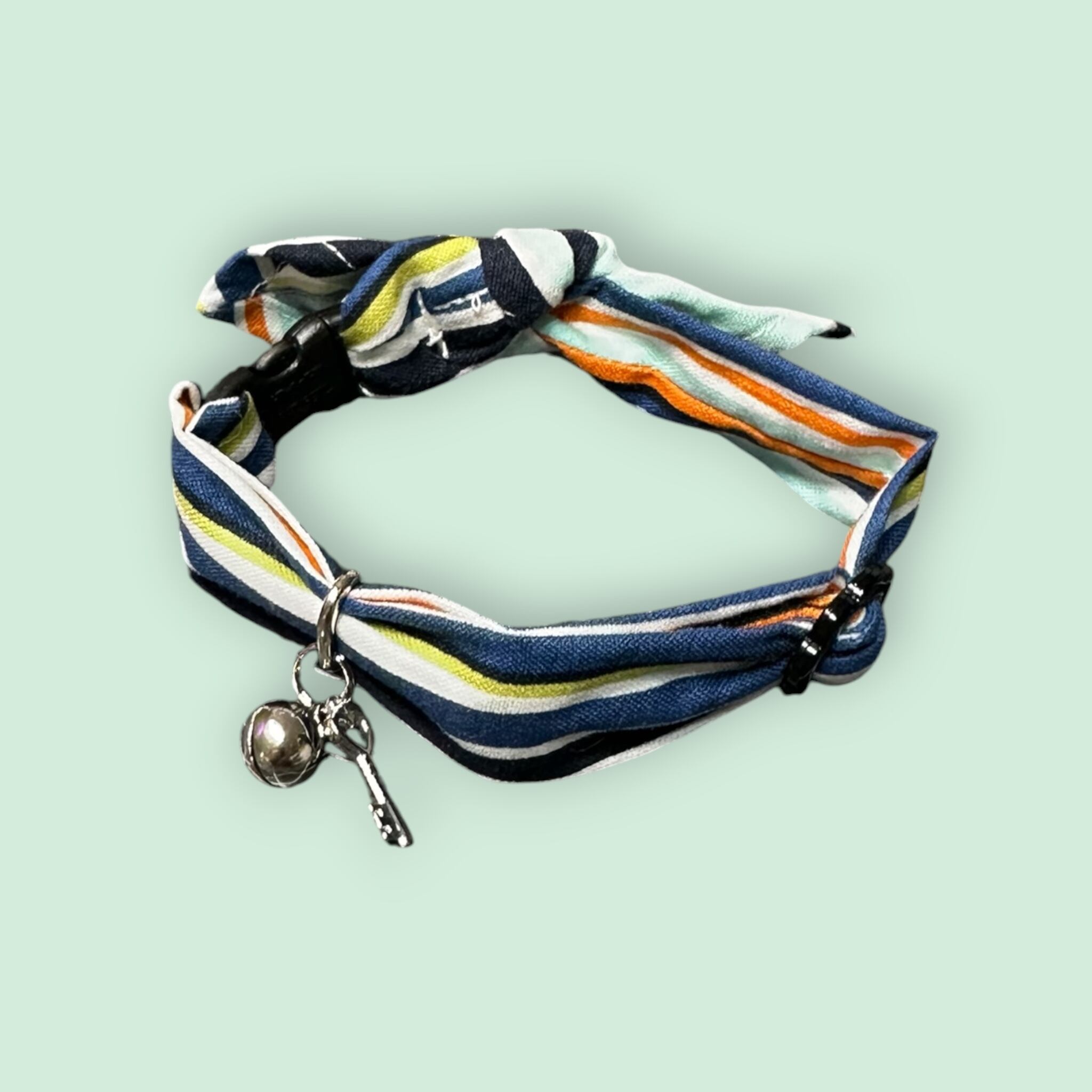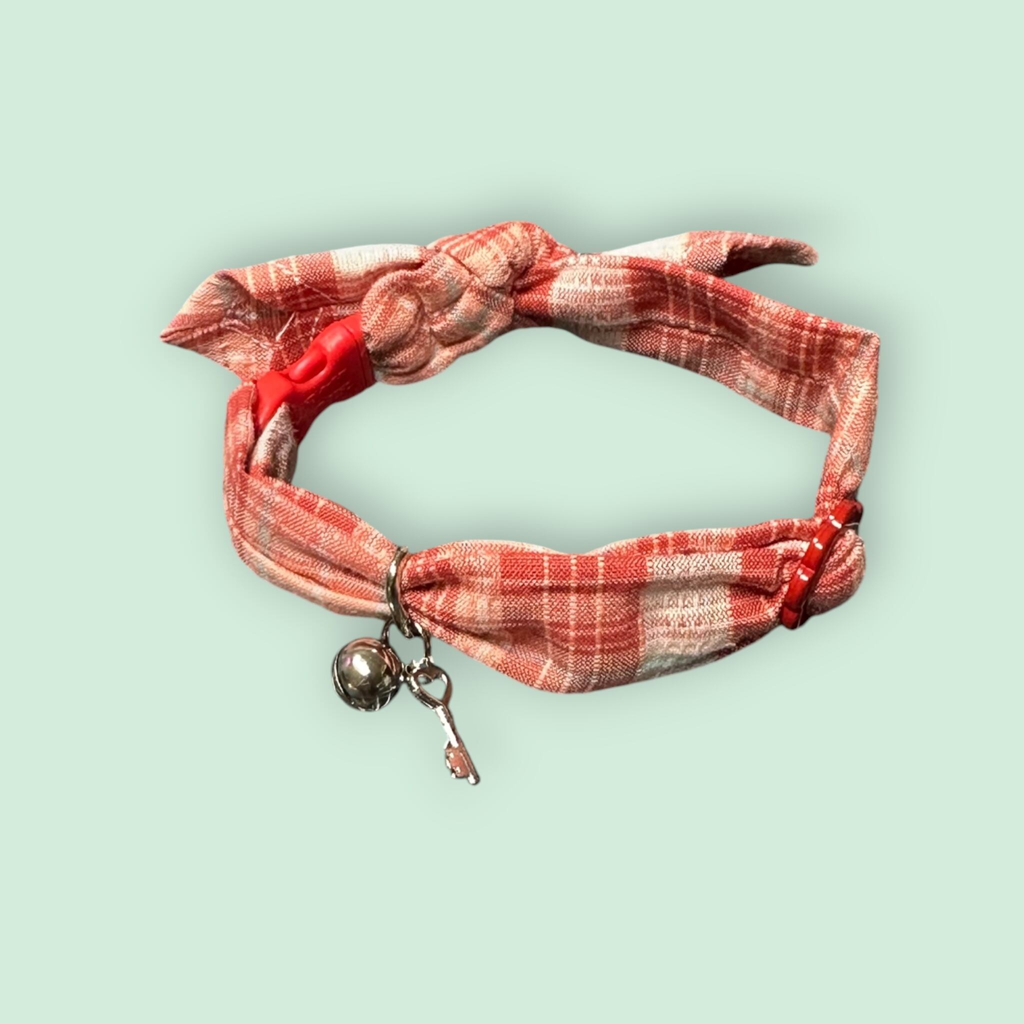 バックル部分に付いている鈴とカギのチャームは、ネコちゃんがあむあむしても外れて誤飲しないように、しっかり二重リングでセットされていますが、もちろん取り外したい場合は取り外し出来ます。