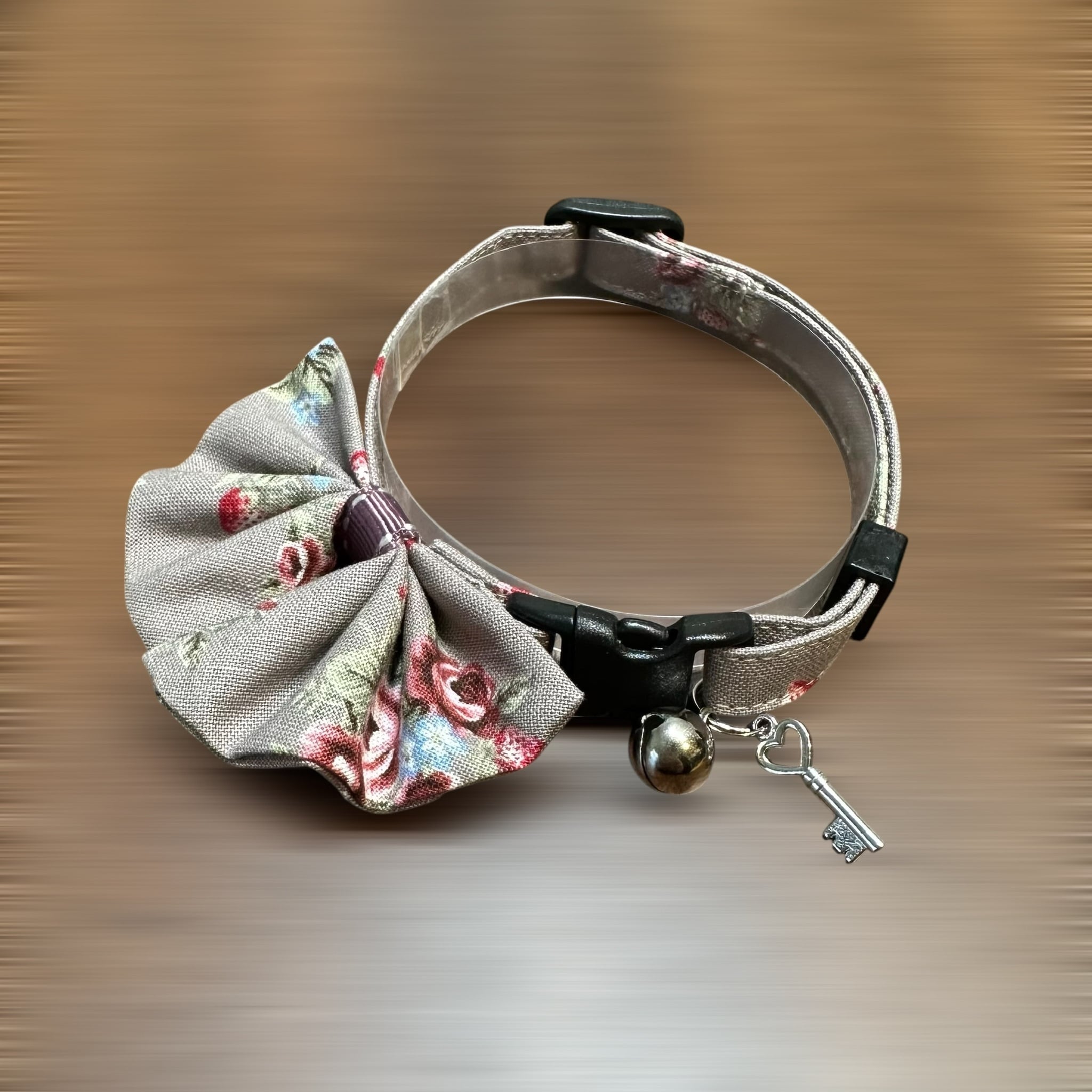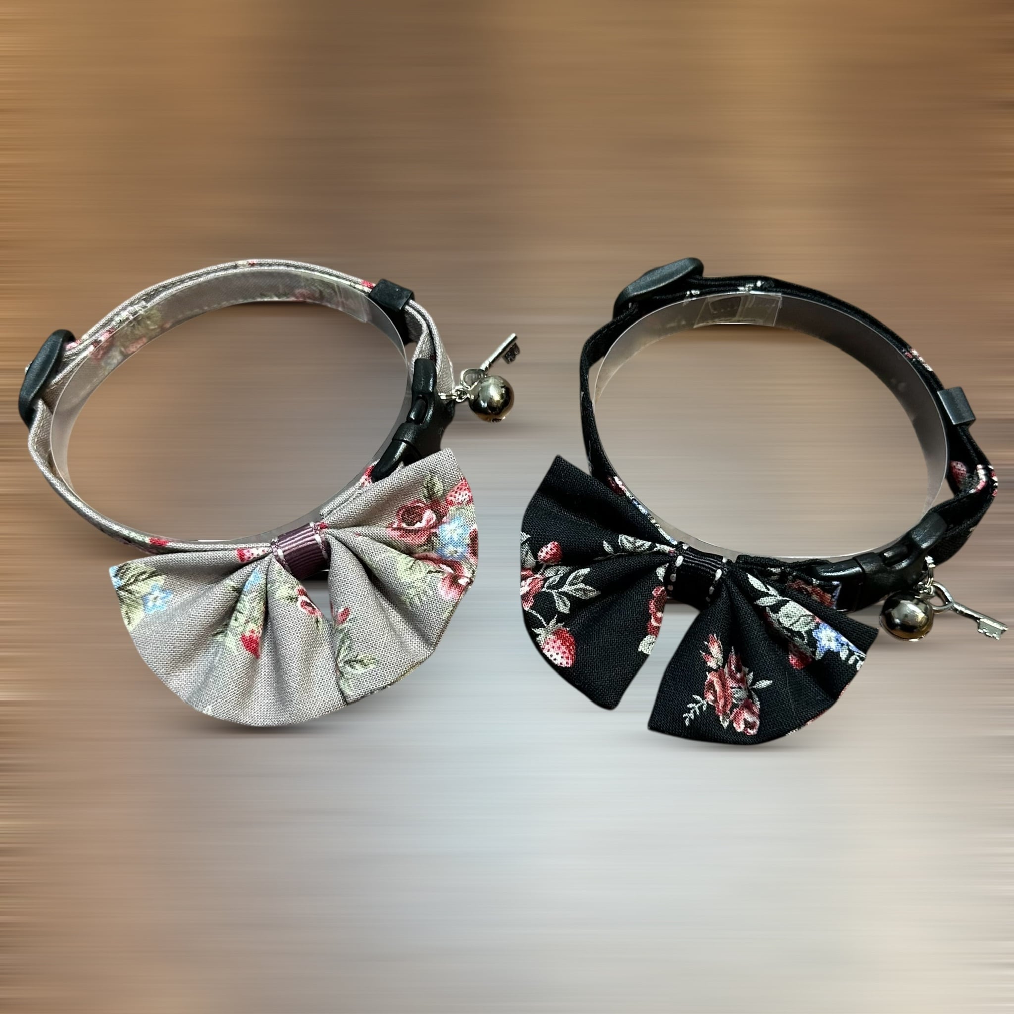 <猫用首輪>プリーツ蝶タイ風首輪〈いちご&バラ柄〉