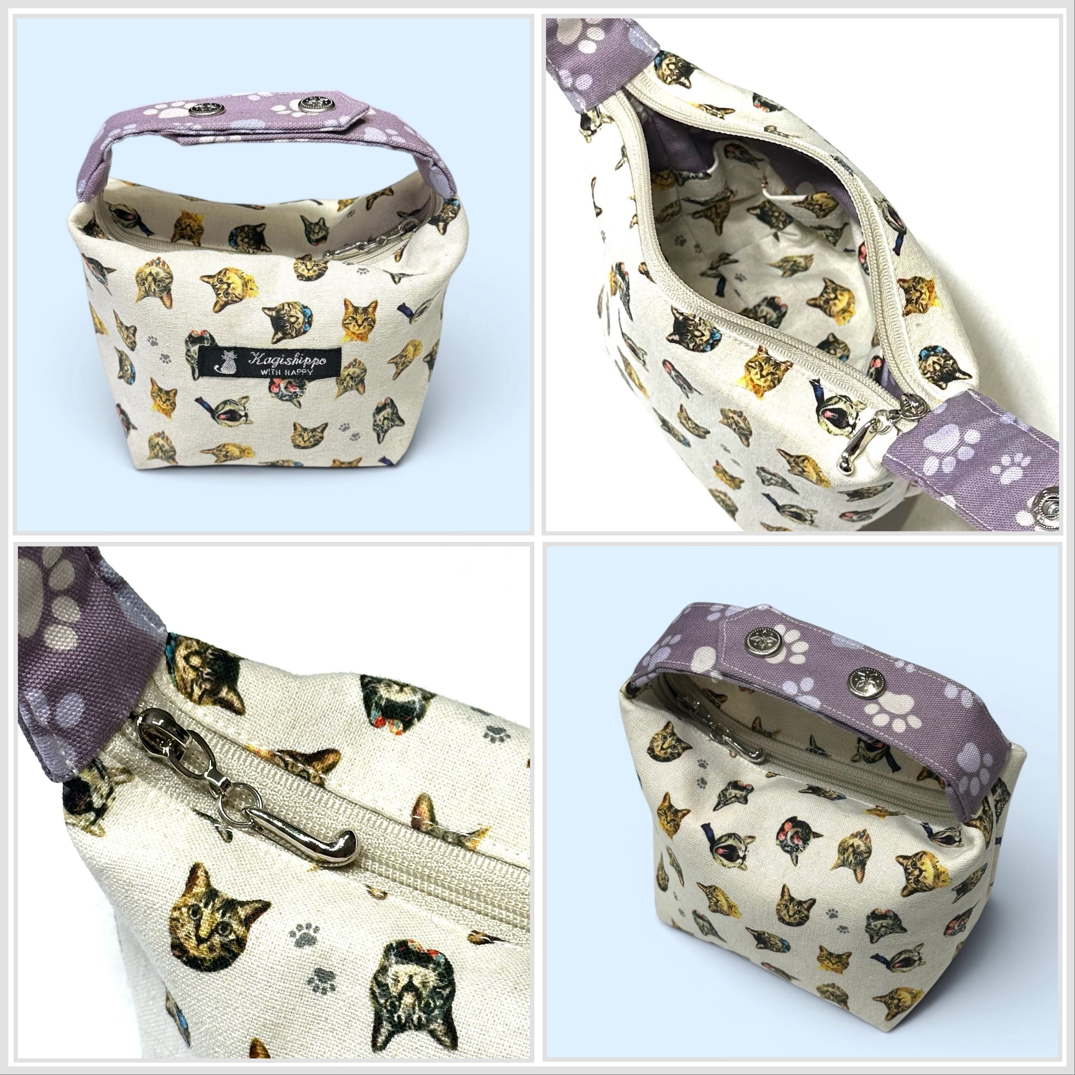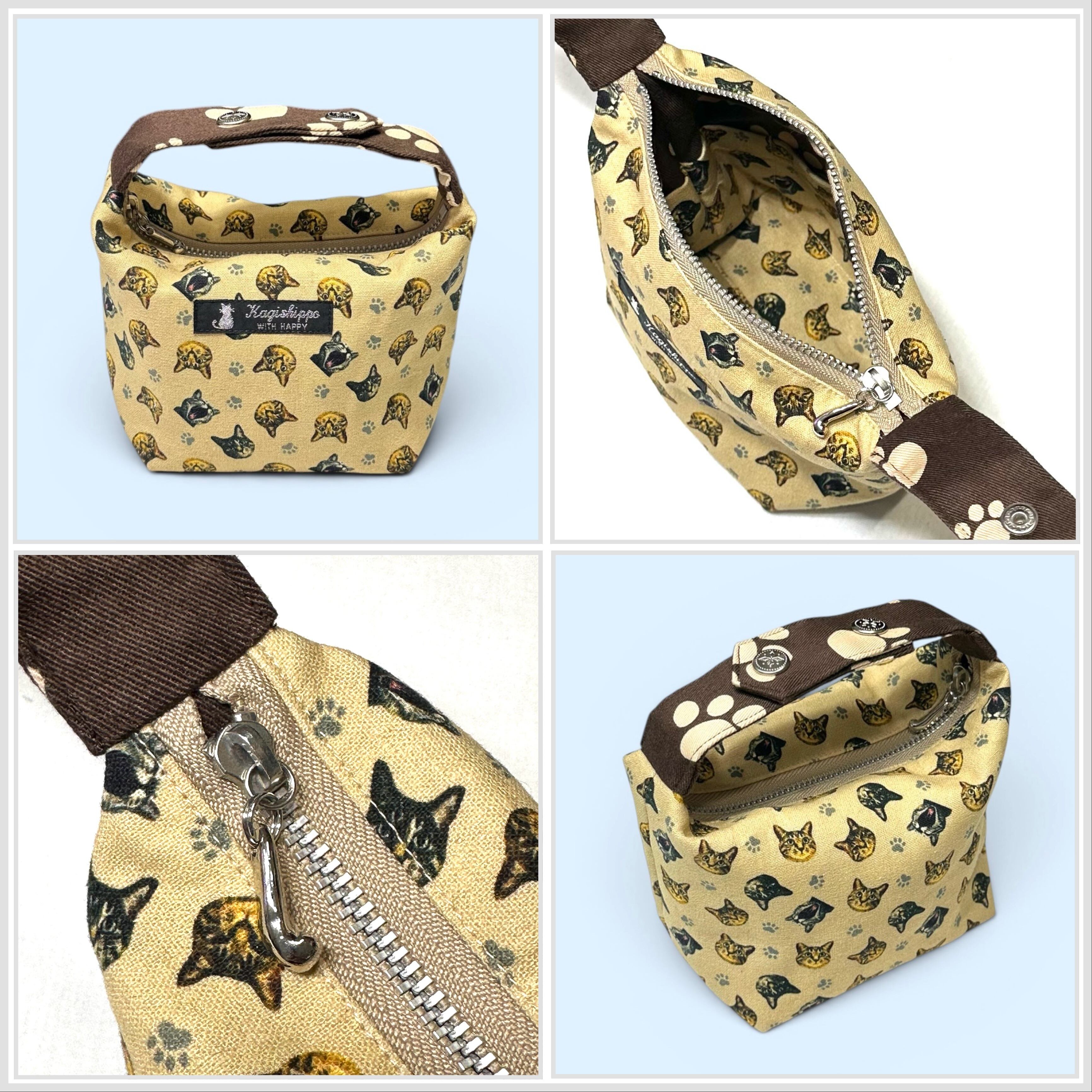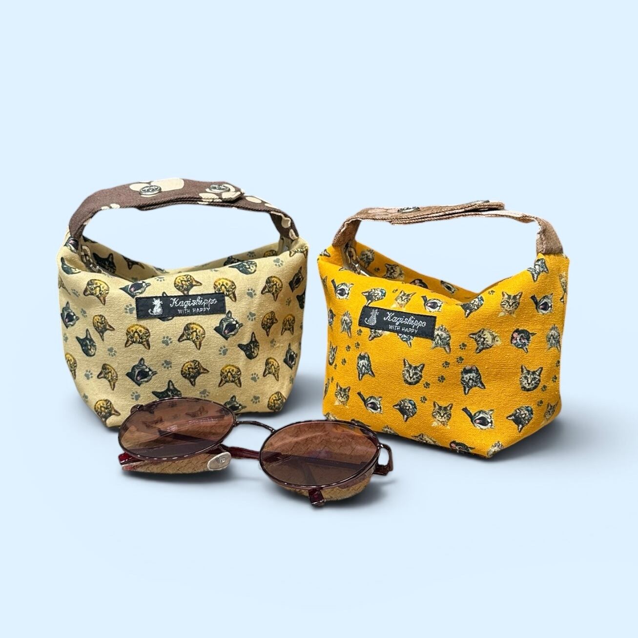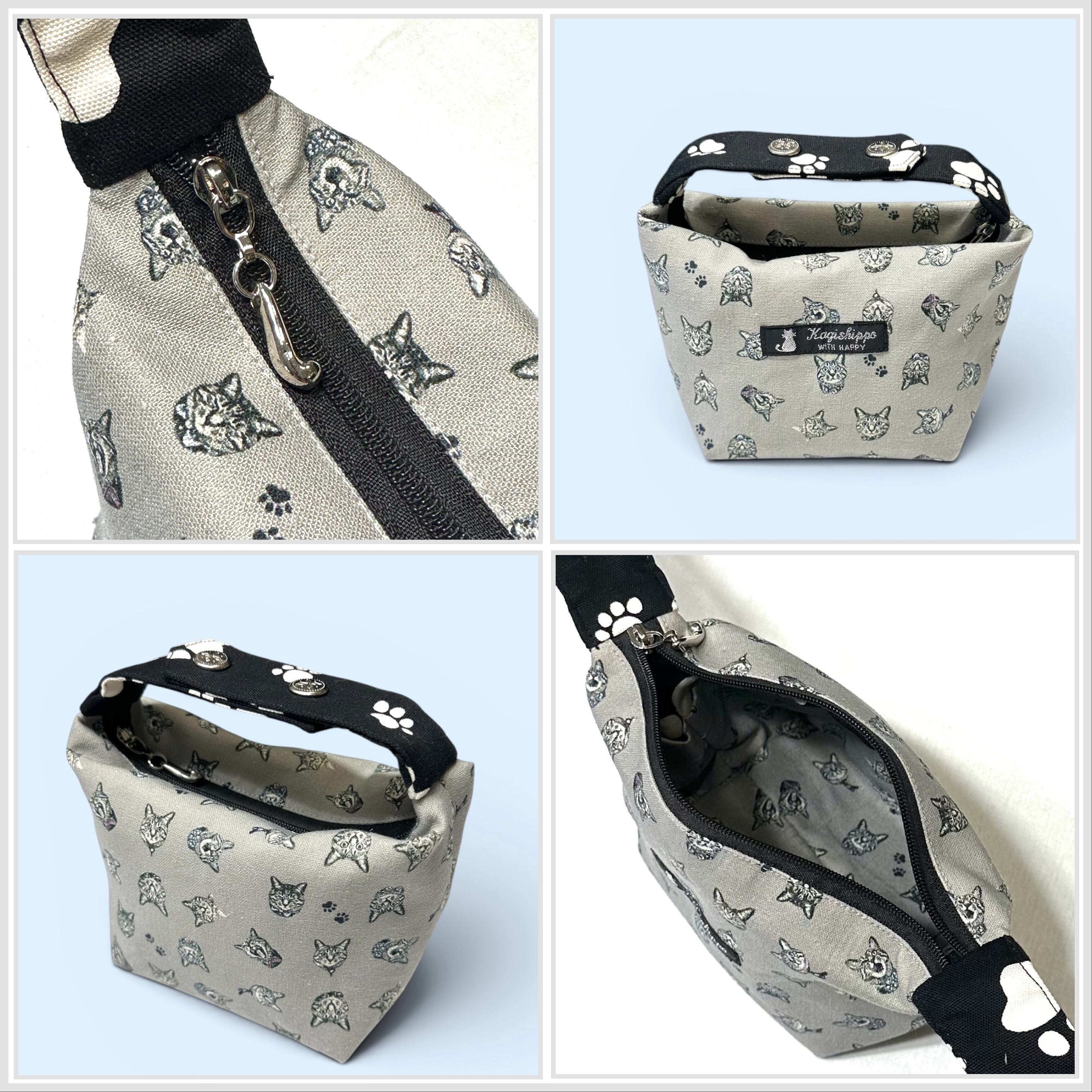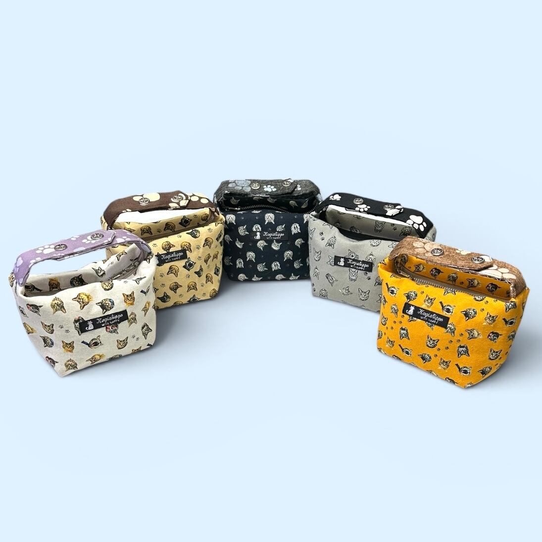 表地はオリジナル猫柄プリントを使用、愛らしい猫たちの表情が詰まっています。毎日のおでかけやちょっとしたお買い物にぴったりなサイズ感で、持ち手が付いているため持ち運びも楽々です!近所への散歩やおつかいの際に、小銭やちょっとした小物を入れるのに最適です。