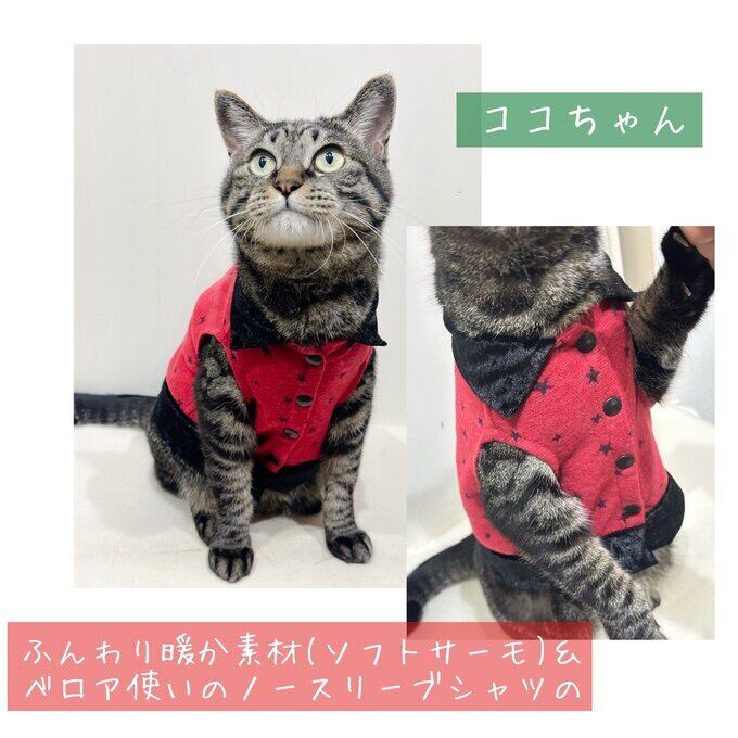 Mサイズは4.5㎏前後の猫ちゃん、Lサイズは5.5㎏前後の猫ちゃんが丁度よさそうですが、ニットなので許容範囲が大きく、Mは4㎏以下の猫ちゃんから、Lは6㎏以上の猫ちゃんまで着用していただけています。