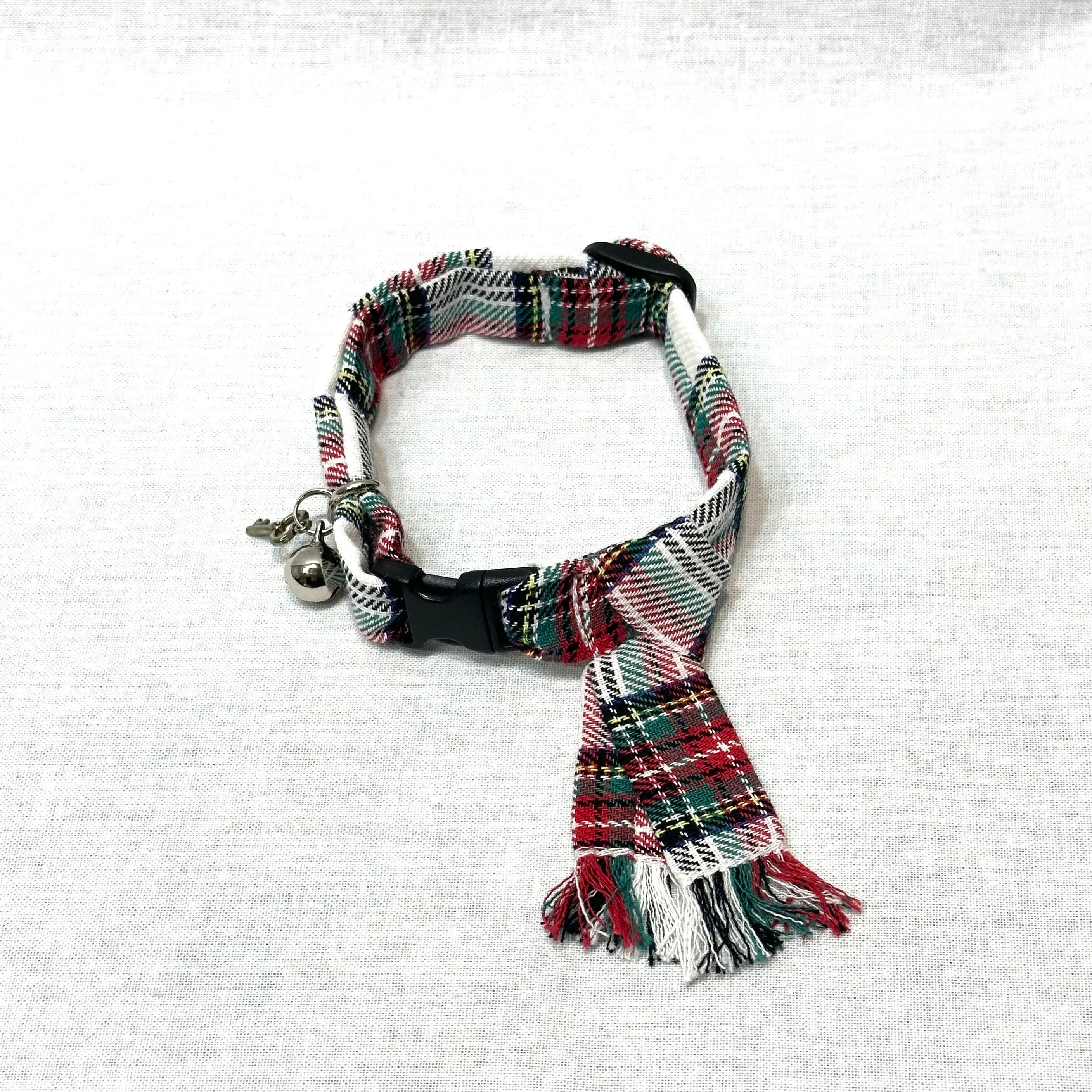 <猫用首輪>タータンチェックのにゃんこマフラー(オフホワイト赤グリーン)